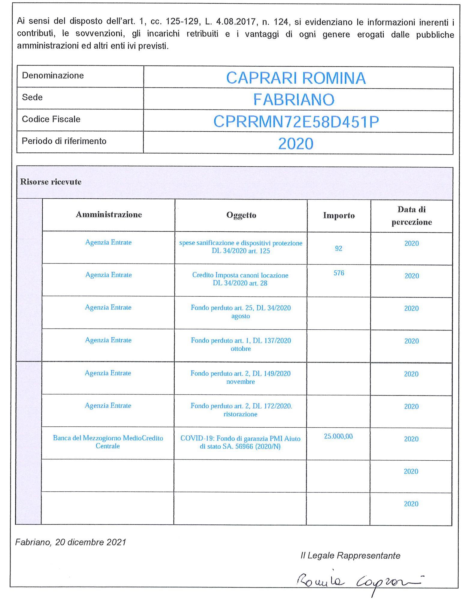 Pubblicazione delle informazioni ai sensi dell'art. 1, cc. 125-129, L. 4.08.2017, n. 124